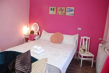 我們當天住的是一間叫做「捲餅屋」的民宿,以我女兒粉紅控嚴重的程度,一進門她就指定要住這間房間,然後開始在老闆娘準備給旅客們的日記本上塗鴉。