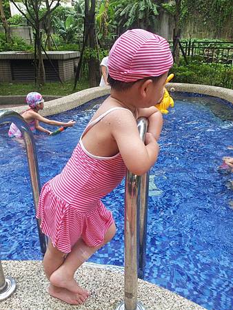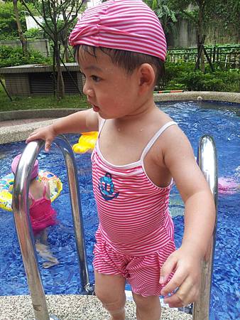 這是小金魚的弟弟-魚弟,他不僅接受了小金魚的泳裝,還是全副武裝,讓我不禁訝異說這到底是哪邊跑來的胖妹?!
