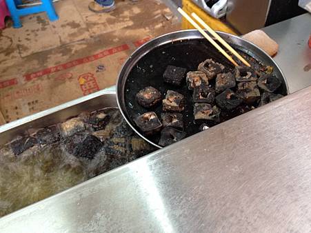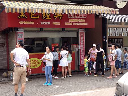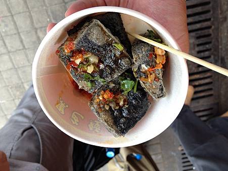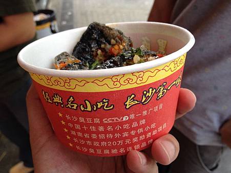 長沙有兩樣很有名的食物,其中一樣是黑色臭豆腐,形狀跟我們台灣的臭豆腐類似,方方正正的,把中間挖洞,裡面塞了滿滿滿的辣椒,豆腐是黑的,湯是黑的,就連店也黑黑髒髒的,這種顏色讓人不敢恭維,感覺像是臭水溝裡面拿出來的,
