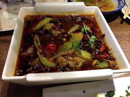 晚上當地業務找我吃飯,我們吃一間在蘇州當地也是很有名,陽光百貨裡面的「辛香匯」,我覺得愛吃辣的人,如果能來蘇州,應該會很開心,因為這邊的辣菜很多都做得很好吃,我要推薦的是圖片裡面這兩道,一道是「水煮牛蛙」,牠真的就是那個牛蛙,吃起來很像雞肉,但我克服不了自己的心理障礙,因為甚麼血管呀,脊椎骨呀都還看得到,而且我會一直想像牠還在世時的樣子,所以只吃了一塊。
