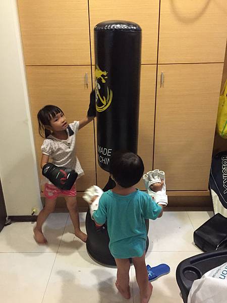 這個武術沙包很重,飄洋過海從對岸過來,付的運費可能都比在台灣買還貴,部過既然買了我就不想再去管那麼多,只是買回來我自己都還沒用,兩個小鬼打得比我還起勁。