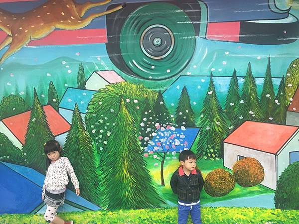 其實我還蠻喜歡幾米的畫風,作品充滿了寓意,尤其是「向左走、向右走」這個故事,更是我的最愛。但因為前一個颱風天鵝已經把主要的藝術品「飛天小火車」給吹壞了,我們只能看剩下的「行李」、「車站」等藝術,還讓琁跟皓留下了這張貌合神離的照片。