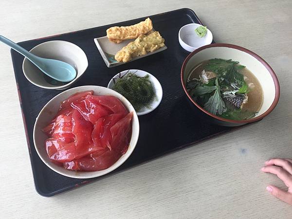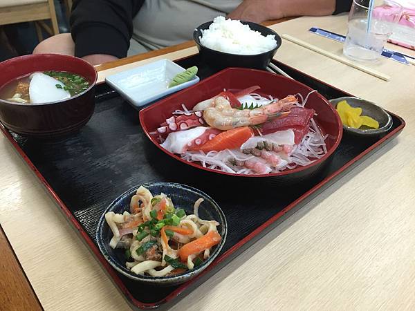 看這尾精美的大龍蝦,還有鋪滿生魚片的蓋飯,味增湯裡面也是真的看的到魚塊。