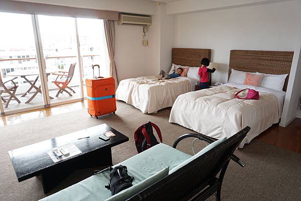 第一天我們住沖繩美濱花園酒店,位於美國村入口,原本在訂房網站上訂的價錢是16000日幣,但有一點小錯誤,後來他收了24000日幣/間,錯誤的過程我就不講了,這間酒店也沒有什麼設施,大概就是民宿等級,但是房間真的很大,還有客廳,View也很棒,加價的部分我們就不計較了。