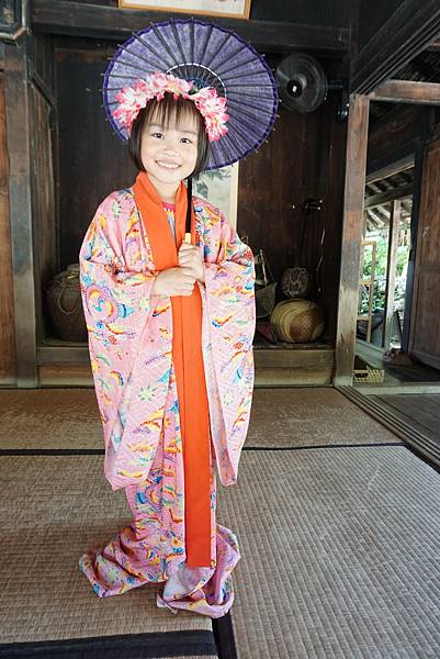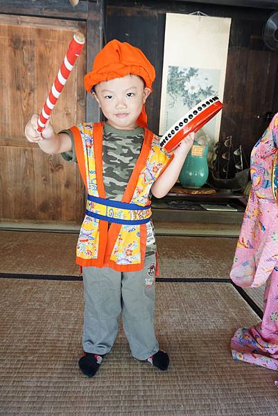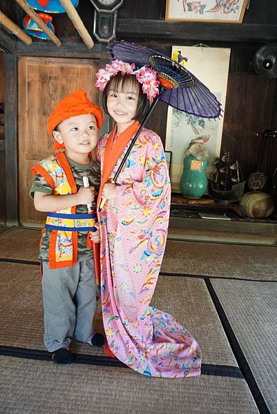 其實琉球村內就是仿照舊時沖繩人民居住的村落所建造,一戶人家挨著一戶人家,在不同的時間點會有不同的表演,所以在這裡我們看到了踊舞和沖繩太鼓,琁跟皓也穿上琉裝過過癮。