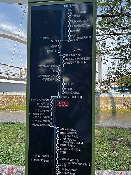 桃園很久以前就修了一條南崁溪腳踏車道,起點是龜山的長壽路,終點是竹圍漁港,沿著南崁溪規劃專門的道路讓人家行走、騎車,一路上也有公園、廟宇、座位可以讓人休息。